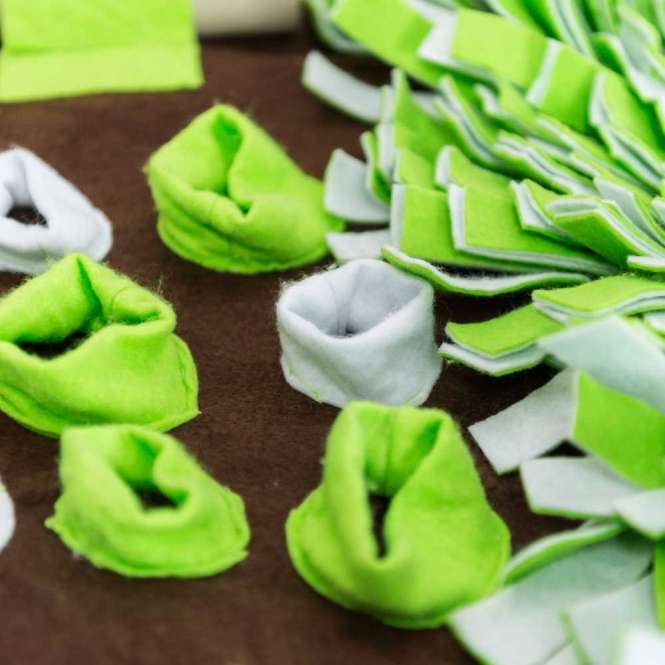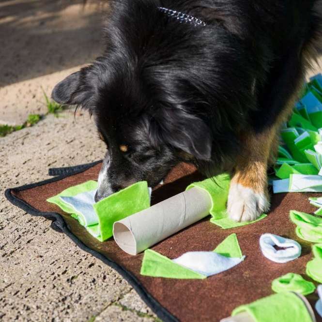 Die Intelligenzschnüffelmatte ist 80 x80cm groß und besteht zur Hälfte aus einer Schnüffelwiese. Die andere Hälfte besteht aus über 20 Leckerli-Versteckmöglichkeiten in sieben verschiedenen Variationen und bietet Ihrem Vierbeiner jede Menge Beschäftigung, Herausforderung und Spaß.